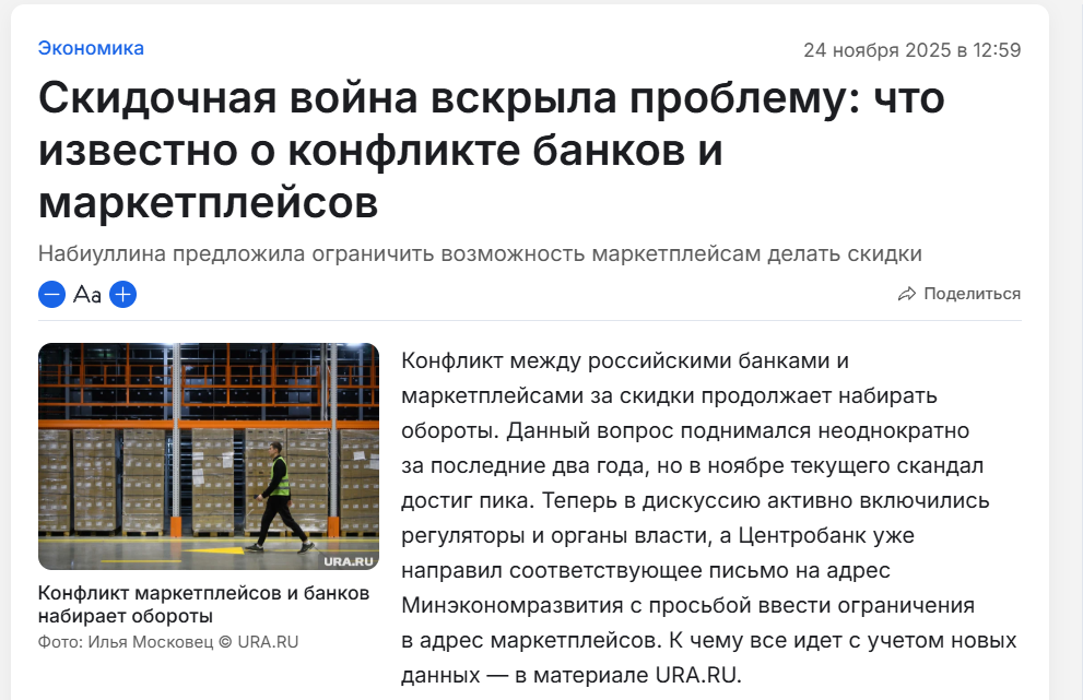 Когда регулятор видит такой риск, он первым делом режет самые агрессивные инструменты роста. В нашем случае это как раз скидки и специальные цены при оплате картами банков самих маркетплейсов.