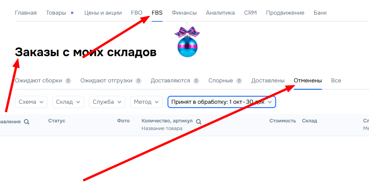 Отмены смотрятся в зависимости от модели работы: FBO или FBS. Логика одинаковая: вам нужен список заказов и фильтр по статусу «Отменены».