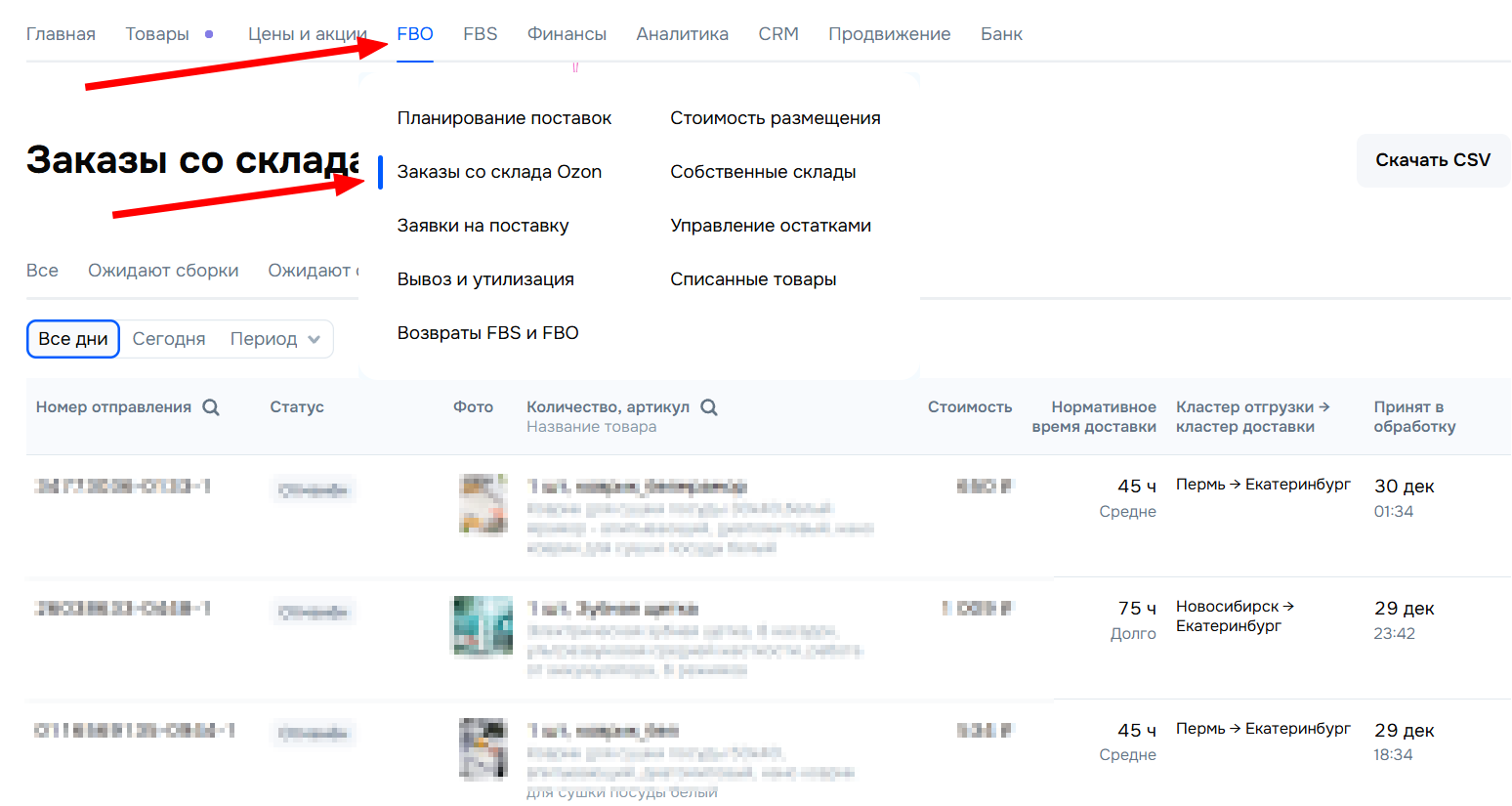 - Откройте раздел «Заказы со склада Ozon»